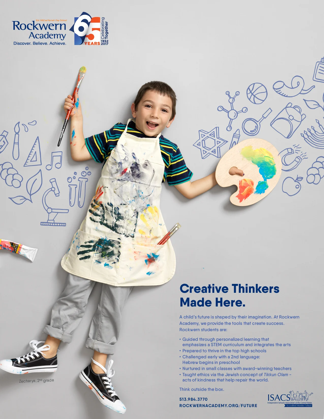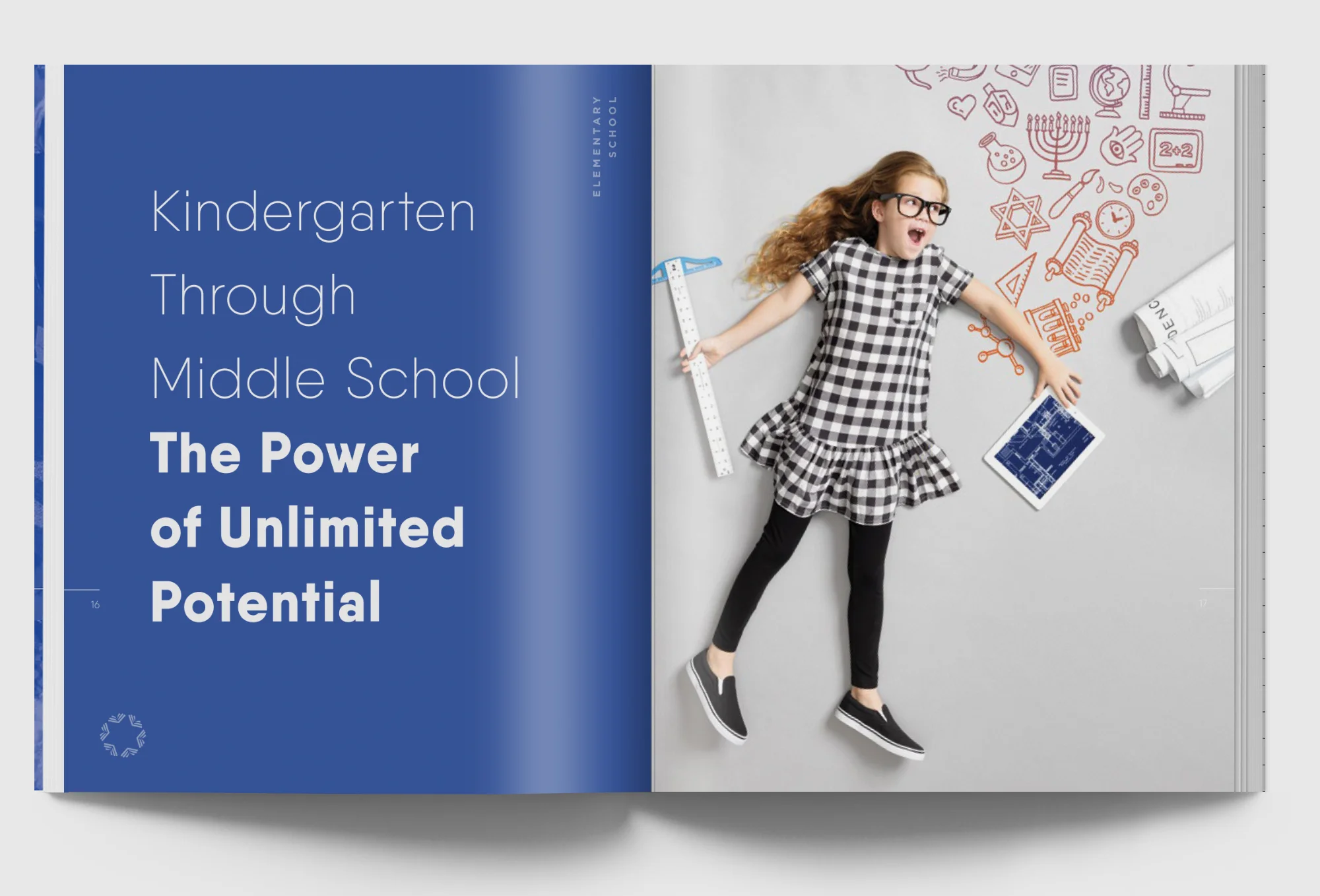 I hoped to create a campaign where these fun little personalities could shine. At the same time, the client wanted me to emphasize science and engineering, and ensure that Rockwern's identity as a Jewish school was clear. I presented a number of concepts and the client selected my favorite - using real students, we depicted them in future careers with as few props as possible, surrounded by illustrations that tied in STEM and Judaism, and suggested limitless imagination as well.