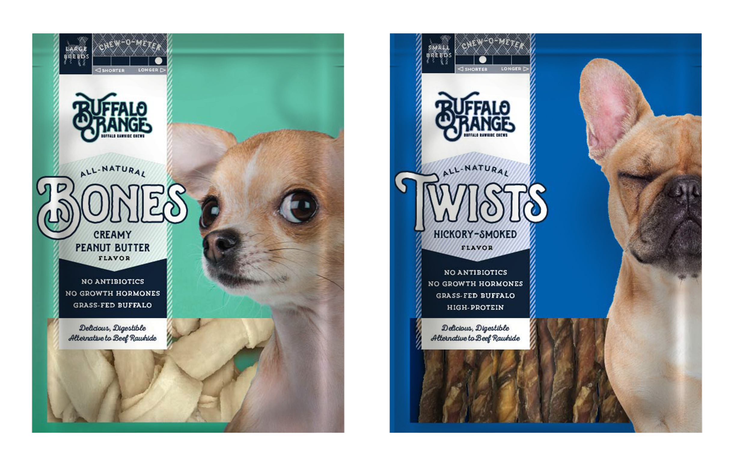 Logo and packaging design for dog treats made from water buffalo. Concepts were delivered to Retail Products Group in-house design department.